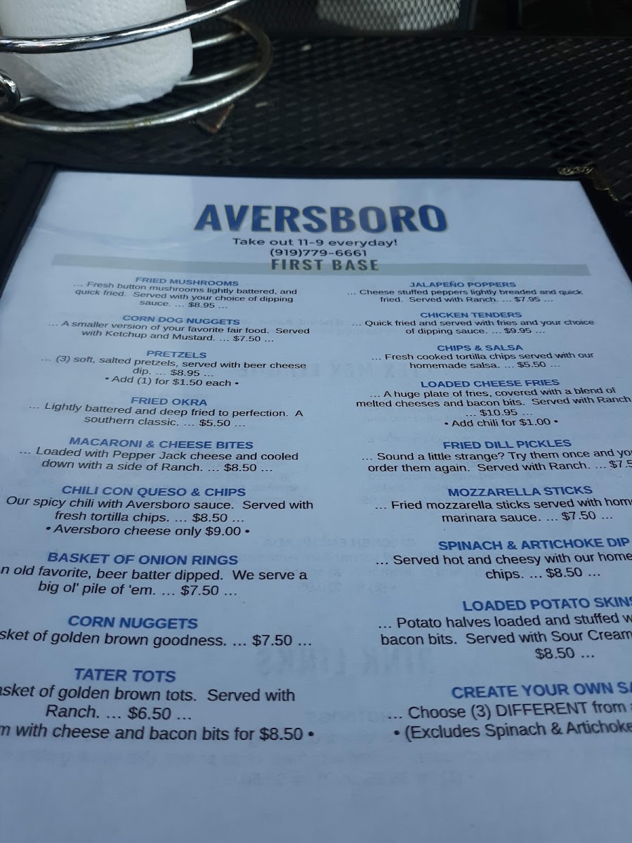 The original knife and fork cheeseburger and fries. A half-pound of ground Angus on top of a thick-cut slice of white bread, covered with French fries and our signature spicy Aversboro sauce made with jalapenos and red peppers.